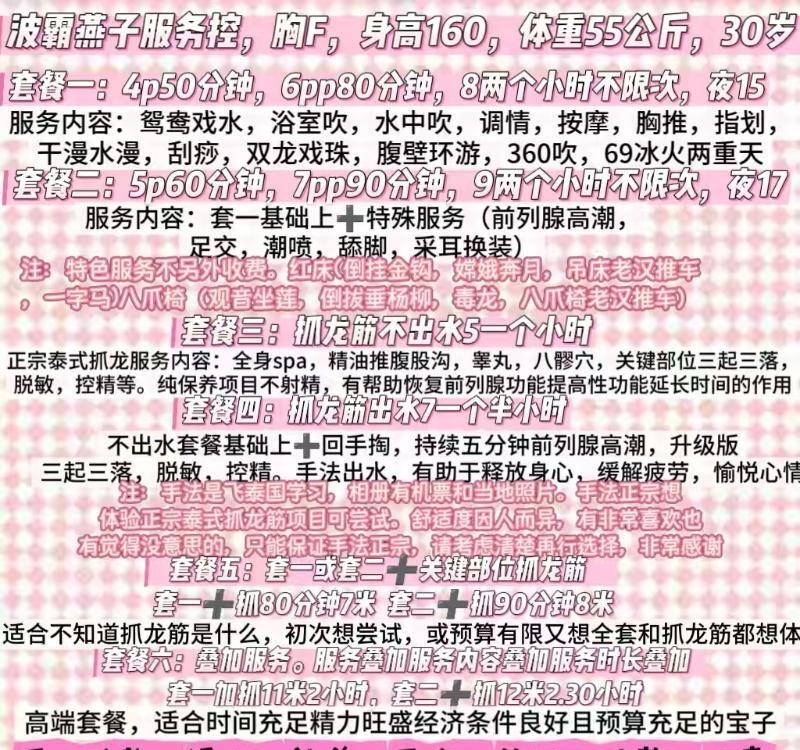 论坛上看到的燕子,加了好友询问了菜单,内容很丰富,选了一个自己喜欢的套餐,全程遥控上楼,进门很是热情主动,帮忙宽衣,一起沐浴,燕子的胸真实,很大,身材微胖,调情很诱惑主动,到了床上开始体验服务,舔手舔脚都是其特色服务,随后就喊老...未登录用户只显示部分内容,完整内容请登陆后查看